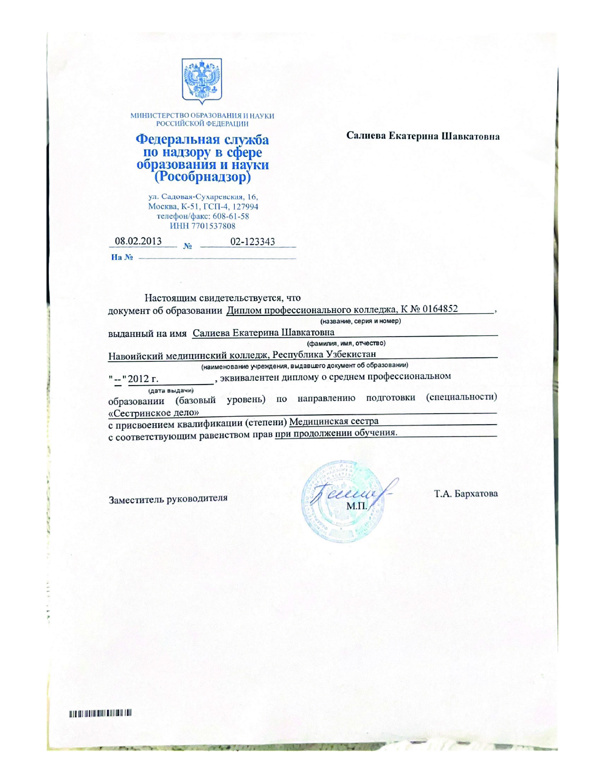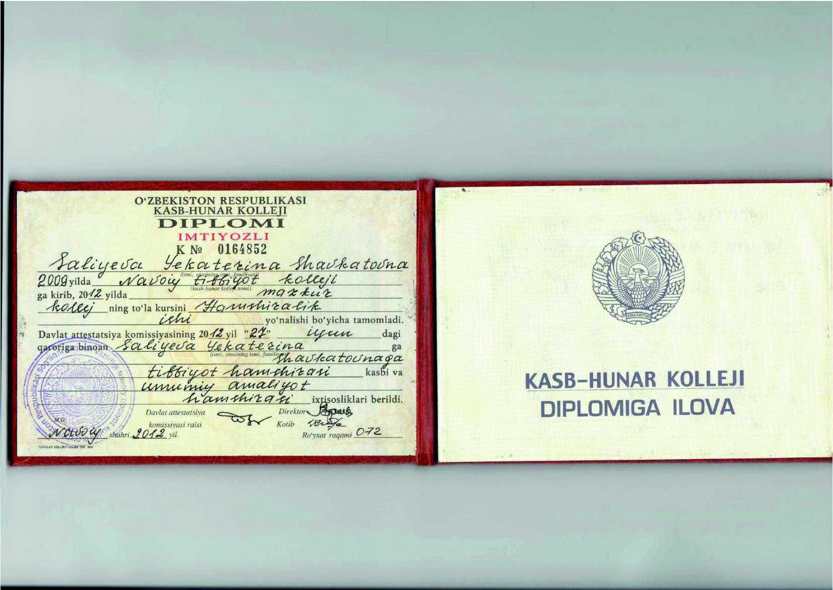 Образование: - 2006гг. – 2009гг: Навойский Государственный Медицинский колледж. Узбекистан. г. Навои Кафедра: Сестринское дело. Специализация: Медицинская Сестра